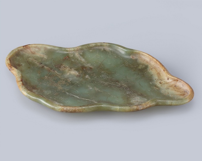 和田玉圓雕荷葉筆掭,淺式,雕作卷邊荷葉形。筆掭內外陰刻荷葉脈線(xiàn)。蹍琢簡(jiǎn)練,玉質(zhì)瑩潤。