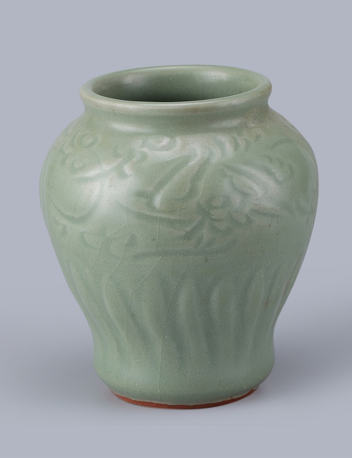 微撇口,短頸,豐肩,肩下漸收斂,圈足。通體施青釉。肩部刻菊花紋飾,近底處刻菊瓣紋。此尊造型古樸,釉質(zhì)溫潤,紋飾構圖寫(xiě)意飄逸。