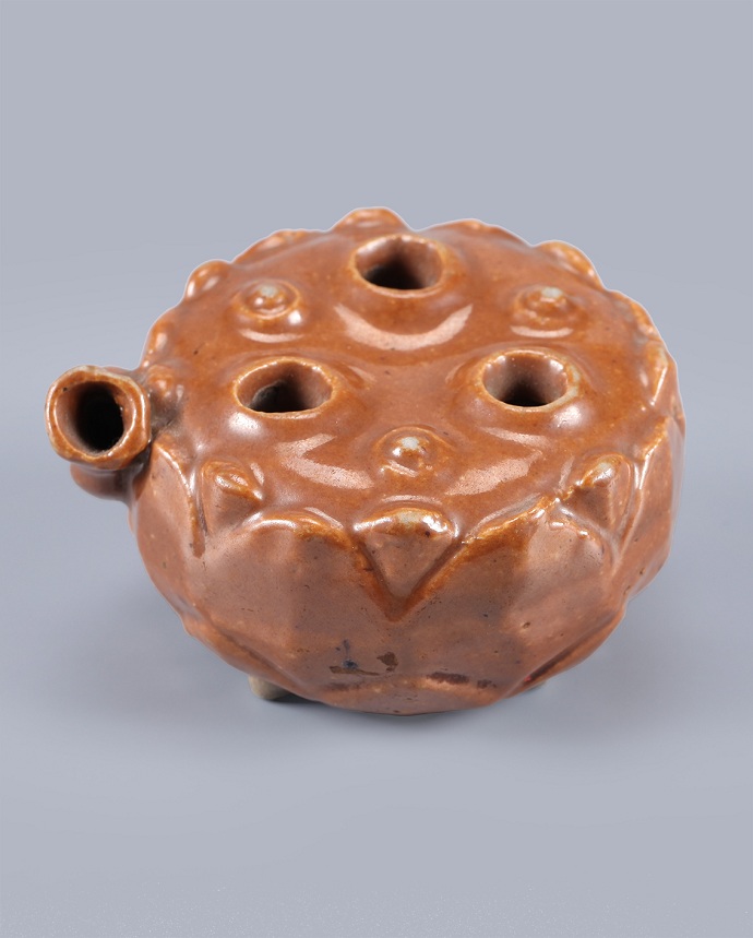 此為蓮蓬形水滴,蓮蓬面有三小孔,蒂部小孔為水注,器身雕蓮瓣紋。全器施柿子紅釉,光澤內斂。鑄形像生而巧妙實(shí)用。在《飲流齋說(shuō)瓷》中說(shuō):“水滴,像形者,其制甚古,蟾滴、龜滴,由來(lái)歸矣。古者以銅,后世以瓷,明時(shí)有蹲龍、寶象諸狀,凡作物形而貯水不多者則名曰滴,不名曰盂?!?span>