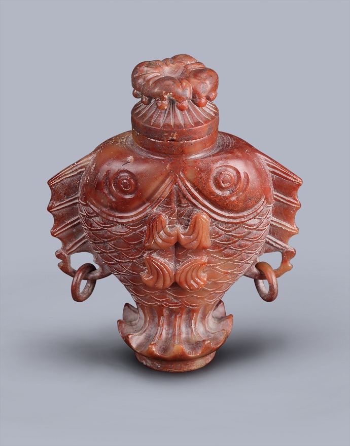 此為壽山圓雕雙魚(yú)榼,通體成魚(yú)形,圓雕海水紋飾為蓋,瓶口為魚(yú)口,兩魚(yú)雙鰭為系,鰭下有環(huán)。魚(yú)目、魚(yú)鱗、魚(yú)尾琢刻逼真。榼,為盛酒器。唐代詩(shī)人白居易詩(shī)中有云:“何如家醞雙魚(yú)榼,雪夜花時(shí)長(cháng)在前?!彪p魚(yú)榼造型盛酒器,始于唐代,多見(jiàn)于長(cháng)沙窯、唐三彩、刑窯以及廣東車(chē)水窯。