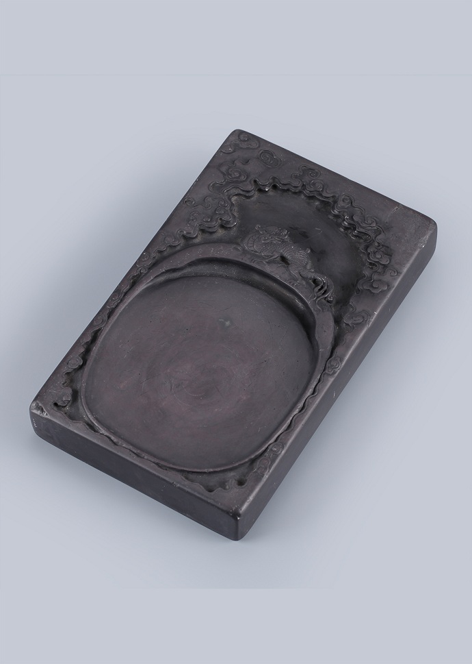 此硯為端石制,長(cháng)方形。硯面上四周雕祥云,正中一龍伏于硯堂邊上,昂首仰望。硯石偏紫,質(zhì)地細膩、純凈無(wú)暇,雕琢精妙,實(shí)為難得。