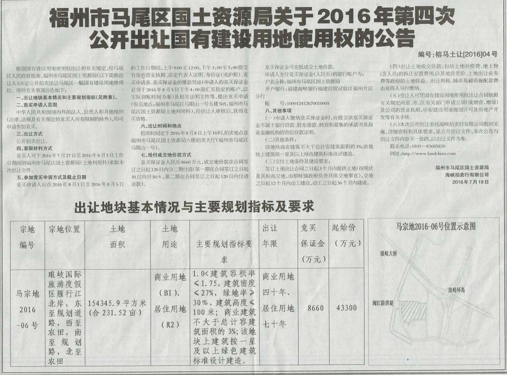 :福州市馬尾區國土資源局關(guān)于2016年第四次公開(kāi)出讓國有建設用地使用權的公告