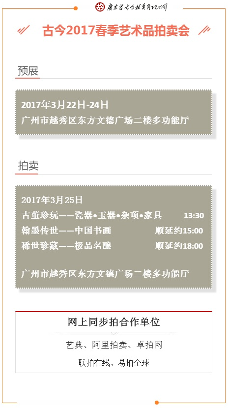 古今2017春拍預展將于3月22日至24日在東方文德廣場(chǎng)舉行。誠意呈獻【古董珍玩——瓷器?玉器?雜項?家具】、【翰墨傳世——中國書(shū)畫(huà)】、【稀世珍藏——極品名釀】等三個(gè)專(zhuān)場(chǎng),涵蓋古今藝術(shù)品超過(guò)600件,本期精選部分拍品,先睹為快。