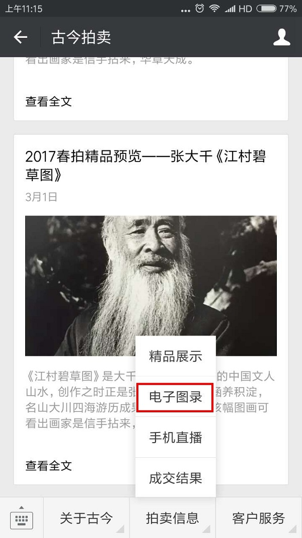 2.點(diǎn)擊古今拍賣(mài)微信下方拍賣(mài)信息板塊——點(diǎn)擊“拍賣(mài)信息”——點(diǎn)擊“電子圖錄”