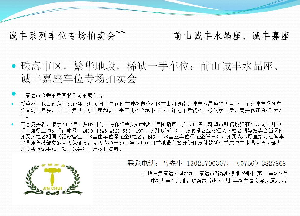 珠海市區,繁華地段,稀缺一手車(chē)位:吉大誠豐水晶座、誠豐嘉座車(chē)位專(zhuān)場(chǎng)拍賣(mài)會(huì )2017年11月26日舉辦