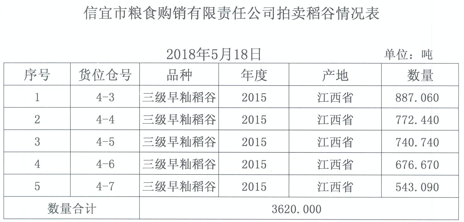 受委托,我行定于2018年5月31日上午10時(shí)在信宜市人民路89號四樓拍賣(mài)大廳公開(kāi)舉行拍賣(mài)約3620噸縣級儲備糧(稻谷)輪換銷(xiāo)售拍賣(mài)會(huì ),分五個(gè)標的拍賣(mài),每個(gè)標的競買(mǎi)保證金20萬(wàn)元。