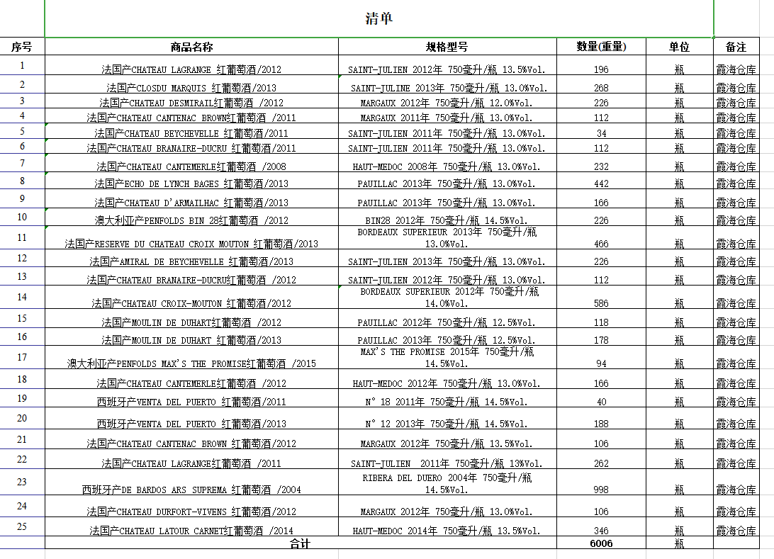 1、紅酒6006瓶(存放倉庫位于湛江霞海;該項標的競買(mǎi)人必須具備相關(guān)酒類(lèi)經(jīng)營(yíng)許可證書(shū)并經(jīng)我司審查通過(guò)后才能參加競投)。