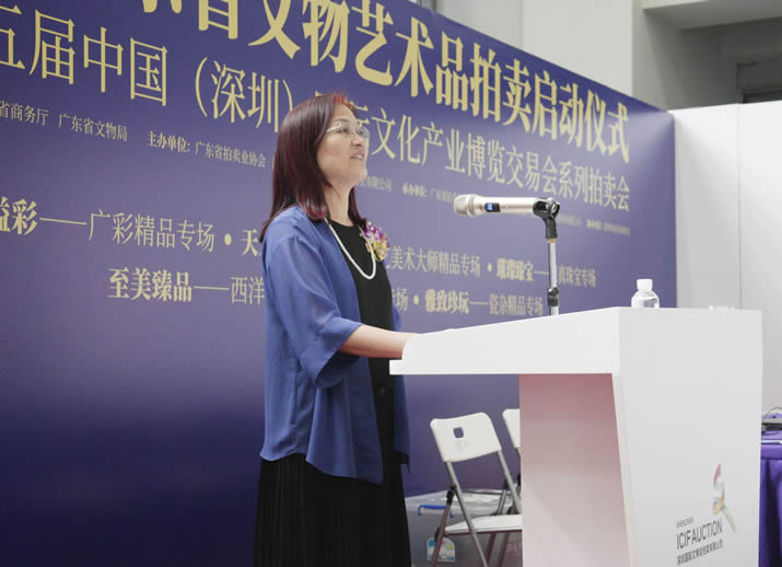 隨后,活動(dòng)主辦方廣東省拍賣(mài)業(yè)協(xié)會(huì )會(huì )長(cháng)雷敏致辭,她向到會(huì )嘉賓介紹近年全國及廣東省藝術(shù)品拍賣(mài)的情況?;仡櫲ツ陞f(xié)會(huì )在第十四屆文博會(huì )上進(jìn)行了文物藝術(shù)品拍賣(mài)啟動(dòng)儀式,以及在第七屆廣州金交會(huì )財富論壇上向社會(huì )介紹藝術(shù)拍賣(mài)財務(wù)擔保模式兩次活動(dòng),都得到了同行及社會(huì )的廣泛關(guān)注。雷會(huì )長(cháng)提出,藝術(shù)品拍賣(mài)的發(fā)展需要整合行業(yè)優(yōu)質(zhì)資源,鼓勵廣州、深圳的龍頭企業(yè)與各市企業(yè)合作;同時(shí)加強我省藝術(shù)品拍賣(mài)與跨領(lǐng)域、跨地域文化產(chǎn)業(yè)間的交流與合作,打造藝術(shù)品拍賣(mài)和相關(guān)服務(wù)的開(kāi)放平臺,實(shí)現互利互贏(yíng)。