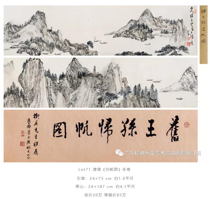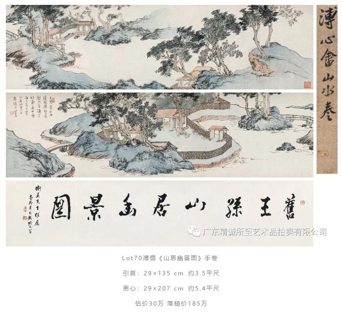 此次秋拍的明星拍品溥儒二個(gè)手卷,因來(lái)源可靠,名家遞藏等因素,在預展前已經(jīng)吸引各方藏家關(guān)注。其中《山居幽景圖》,更因畫(huà)風(fēng)典型、意境悠遠,設色典雅而備受矚目。拍賣(mài)當天現場(chǎng)競價(jià)激烈,從30萬(wàn)起拍,最終以185萬(wàn)落槌。從收藏角度看,這個(gè)手卷筆墨技法多變,通景式構圖,畫(huà)面所表現的正是溥儒中年的理想生活以及他的思想境界,是很有內涵、很可把玩之物。