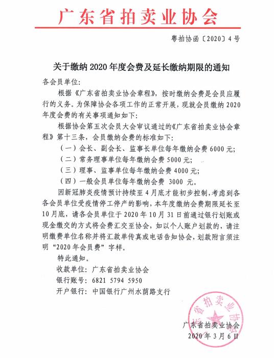 廣東拍賣(mài)業(yè)協(xié)會(huì ) 關(guān)于繳納2020年度會(huì )費及延長(cháng)繳納期限的通知