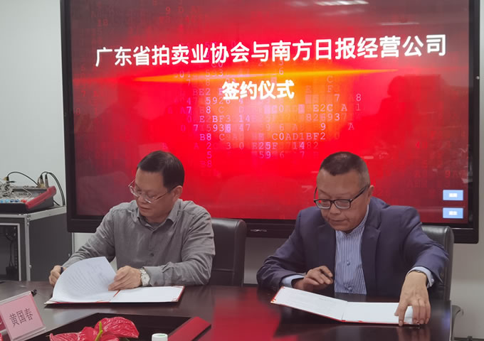 今天(23日)下午,廣東省拍賣(mài)業(yè)協(xié)會(huì )在南方報業(yè)傳媒集團與南方日報經(jīng)營(yíng)公司簽訂「戰略合作協(xié)議」。南方報業(yè)傳媒集團黨委委員、南方日報社副社長(cháng)譚仕龍和廣東省拍賣(mài)業(yè)協(xié)會(huì )會(huì )長(cháng)鄭曉星出席了簽約儀式。