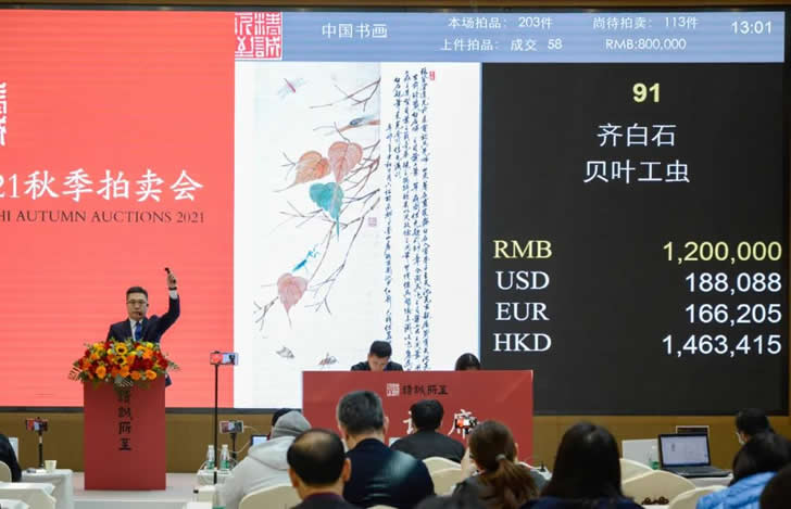 中國書(shū)畫(huà)方面,備受矚目的齊白石《貝葉工蟲(chóng)》與黃賓虹《草亭撫琴圖》,均以120萬(wàn)元交出滿(mǎn)意的答卷。而張善孖與張大千合作的《雄風(fēng)》,尺寸雖僅0.2平尺,最終以17萬(wàn)元成為競得者的囊中佳品。