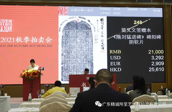 古籍碑帖方面表現一般,但莫伯驥《岳雪樓鑒真法帖》與簡(jiǎn)又文簽贈本《劉猛進(jìn)碑》拓片等有關(guān)廣東題材的拍品仍競爭激烈。