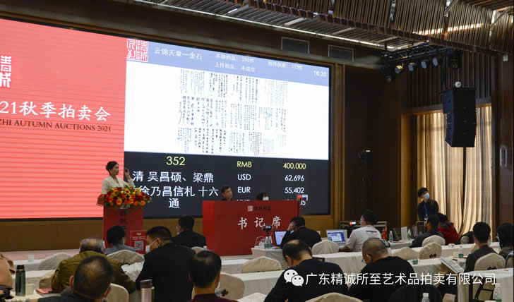 至于信札文獻方面,吳昌碩等致許乃昌信札、譚延闿行書(shū)家書(shū)三通和冼玉清與杜定友致劉國鈞信札和等也表現不俗……在長(cháng)達8個(gè)多小時(shí)的鏖戰中,這些拍品競奪激烈,過(guò)程膠著(zhù),讓人看得心潮澎湃!更多具體成交結果,可查詢(xún)精誠所至微信小程序或登陸公司網(wǎng)站。