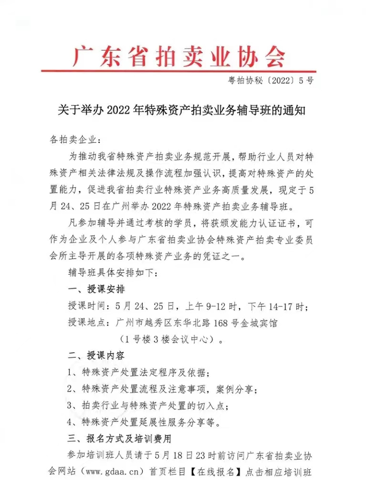 關(guān)于舉辦2022年特殊資產(chǎn)拍賣(mài)業(yè)務(wù)輔導班的通知