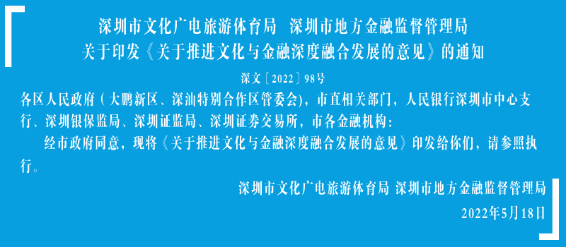 為深入貫徹落實(shí)《中共中央 國務(wù)院關(guān)于支持深圳建設中國特色社會(huì )主義先行示范區的意見(jiàn)》《粵港澳大灣區發(fā)展規劃綱要》《深圳建設中國特色社會(huì )主義先行示范區綜合改革試點(diǎn)實(shí)施方案(2020-2025年)》相關(guān)部署,提高金融服務(wù)文化產(chǎn)業(yè)高質(zhì)量發(fā)展的能力,創(chuàng )建國家文化與金融合作示范區,現就推進(jìn)文化與金融深度融合發(fā)展提出如下意見(jiàn)。