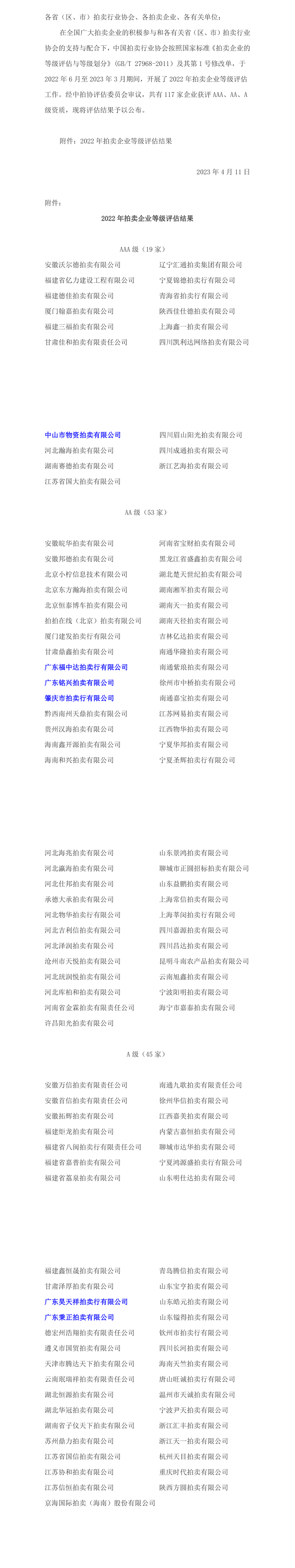 > 2022年拍賣(mài)企業(yè)等級評估結果公告