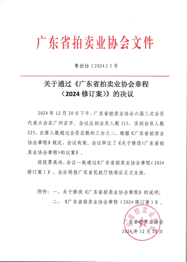 關(guān)于通過(guò)《廣東省拍賣(mài)業(yè)協(xié)會(huì )章程》(2024修訂案)的決議