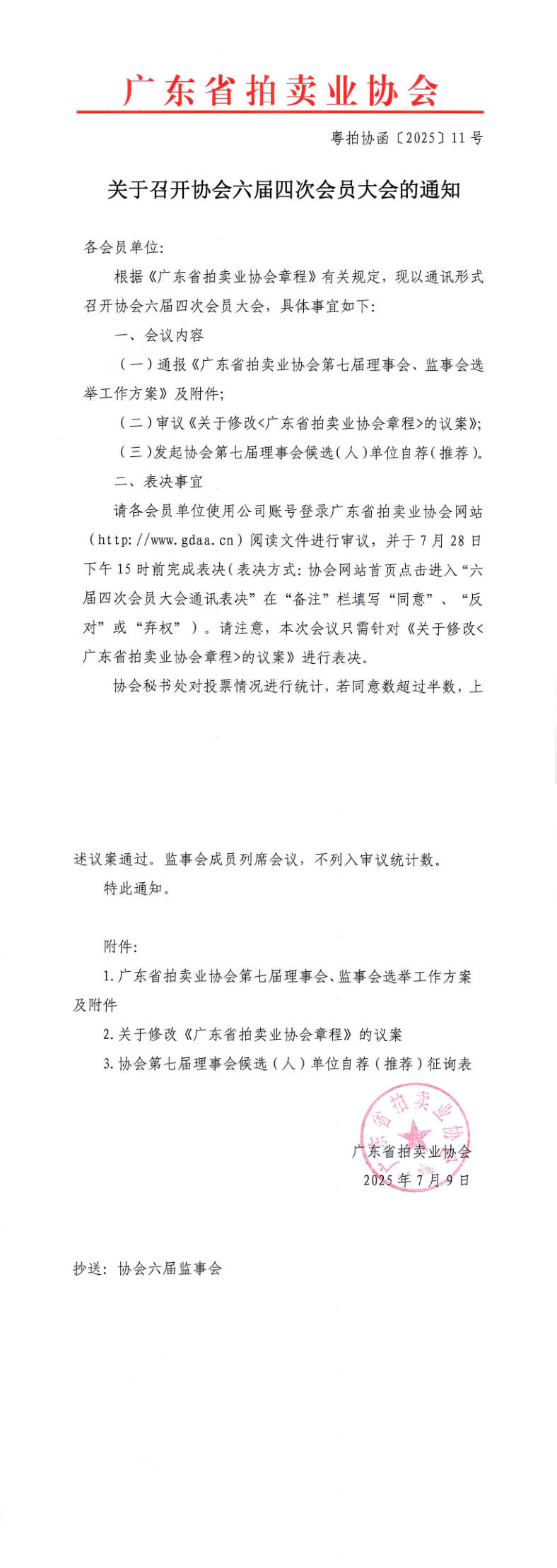 1.廣東省拍賣(mài)業(yè)協(xié)會(huì )第七屆理事會(huì )、監事會(huì )選舉工作方案及附件(點(diǎn)擊下載)