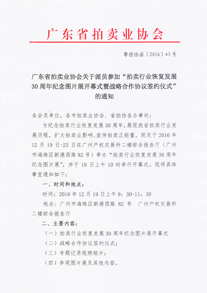 拍賣(mài)行業(yè)恢復發(fā)展30周年紀念圖片展開(kāi)幕式暨戰略合作協(xié)議簽約儀式的通知