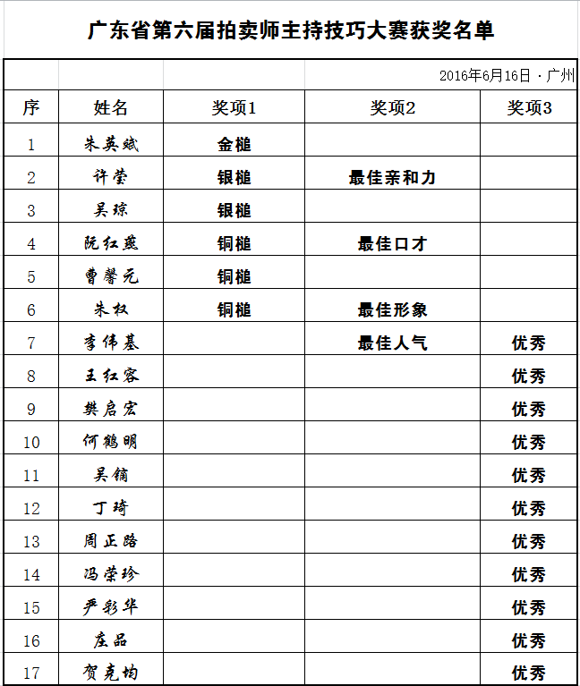 2016年6月16日,廣東省第六屆拍賣(mài)師主持技巧大賽在廣州市東山賓館順利舉行。本屆比賽共有來(lái)自全省各地的近20名拍賣(mài)師同臺角逐。經(jīng)過(guò)一輪激烈競爭,第六屆大賽金槌獎得主朱英斌蟬聯(lián)冠軍、許瑩和吳瓊獲得銀槌獎,阮紅燕、曹馨元和朱權獲得銅槌獎。此外,大賽還選出7名優(yōu)秀拍賣(mài)師作為我省代表,參加今年舉行的第四屆全國拍賣(mài)師競賽。